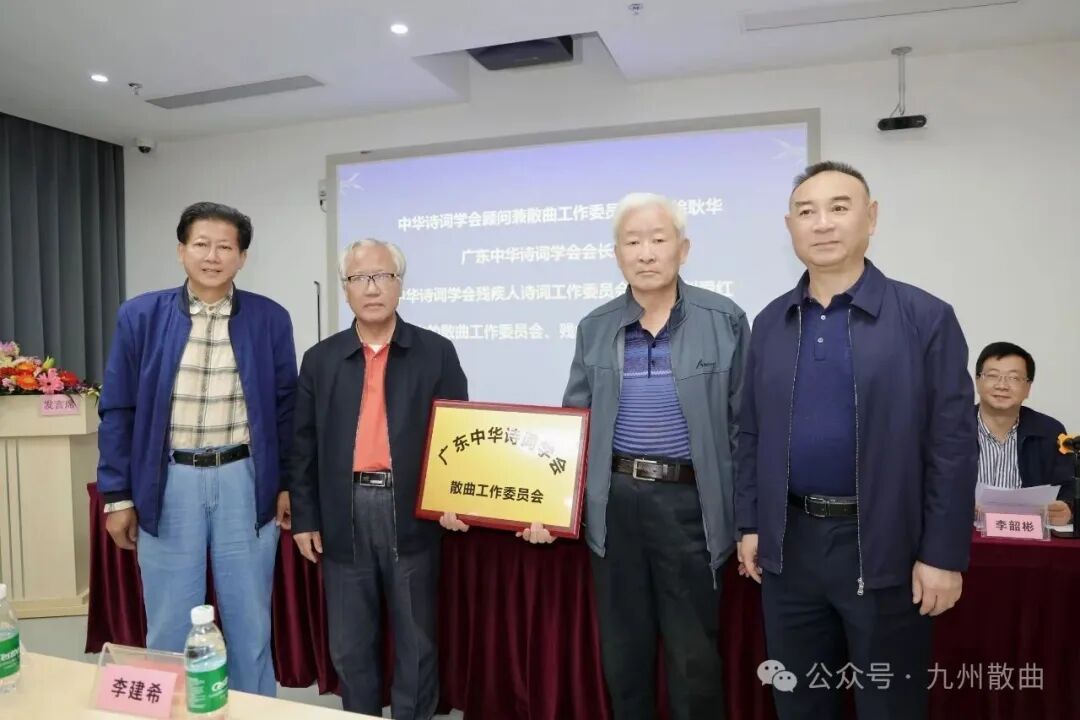 (广东中华诗词学会散曲工委授牌) 随后,主持人宣读了关于同意成立散曲工作委员会及其骨干成员的任命决定。在热烈的气氛中,广东中华诗词学会会长郭杰与中华诗词学会顾问兼散曲工作委员会主任徐耿华共同为散曲工作委员会授牌。