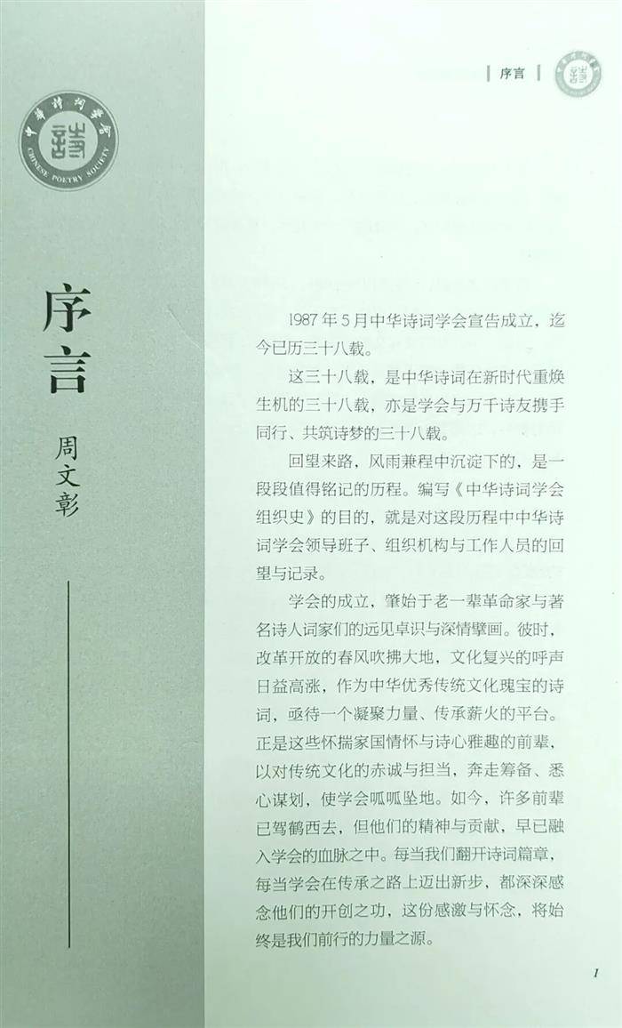 组织史的编写,实际上是对中华诗词学会档案资料的抢救性工作。在编辑过程中,我们有许多感动,也有遗憾。书中肯定存在着一些为中华诗词学会成立和发展做出重大贡献的老领导没有编入的问题。由于时间跨度大,学会因无固定办公场所,经过数次搬迁,存留资料相当有限,本书所录名单疏漏和错谬之处难以避免,只能期待将来逐步修改完善。 (胡宁报道) 附 《中华诗词学会组织史》序言 周文彰 1987年5月中华诗词学会宣告成立,迄今已历三十八载。 这三十八载,是中华诗词在新时代重焕生机的三十八载,亦是学会与万千诗友携手同行、共筑诗梦的三十八载。 回望来路,风雨兼程中沉淀下的,是一段段值得铭记的历程。编写《中华诗词学会组织史》的目的,就是对这段历程中中华诗词学会领导班子、组织机构与工作人员的回望与记录。 学会的成立,肇始于老一辈革命家与著名诗人词家们的远见卓识与深情擘画。彼时,改革开放的春风吹拂大地,文化复兴的呼声日益高涨,作为中华优秀传统文化瑰宝的诗词,亟待一个凝聚力量、传承薪火的平台。正是这些怀揣家国情怀与诗心雅趣的前辈,以对传统文化的赤诚与担当,奔走筹备、悉心谋划,使学会呱呱坠地。如今,许多前辈已驾鹤西去,但他们的精神与贡献,早已融入学会的血脉之中。每当我们翻开诗词篇章,每当学会在传承之路上迈出新步,都深深感念他们的开创之功,这份感激与怀念,将始终是我们前行的力量之源。 三十八年来,学会始终不忘初心牢记使命,推动和引领全国各级诗词组织和广大诗友辛勤耕耘,作用日显、影响日深。学会的历史,早已与中华诗词的当代传承史紧密相连;学会的每一步发展,都承载着诗友们对传统文化的热爱与期许。 自成立之日起,学会组织的演进、工作的开展、成果的积累,便已构成一部鲜活的组织史。整理与记录这部历史,既是对过往的尊重,也是对未来的负责。为此,学会专门成立文献研究部,将编修组织史提上日程。受命以来,文献研究部主任胡宁同志严谨认真,克服困难,查阅旧档案、走访座谈、信息往来,在相关同志的支持帮助下,打捞散落的记忆,拼凑模糊的细节,历经大半年的操劳,这部组织史终于得以完成并内部印行,虽非煌煌巨著,却凝聚着编写者们的心血与诚意。 然而,编史之难,尤在史料。因年代久远,早期资料或散佚难寻,或记载不详;更兼许多亲历前辈陆续离世,口述史的采集多有缺憾,错漏之处在所难免。对此,我们有清醒的认知。我历来做事,秉持 “先解决有无,再追求精细” 的理念。这部组织史的首要意义,在于为学会的历程留下一份可供查阅的底稿,为后续的完善打下基础。它或许不够详尽,或许存在瑕疵,但它填补了学会组织历史记录的空白,让那段开创岁月有迹可循、有据可依。 今日,这部组织史终于问世,我们既感欣慰,亦怀不安。我们深知,它并非最终定稿,而是一个 “进行时” 的开端。在此,诚挚希望各位诗友、同仁在阅读后不吝赐教,若发现错漏之处,或持有未被收录的珍贵资料,敬请告知。我们将持续收集、不断修订,逐步走向精准、系统、完善,真正成为记录学会发展、传承诗坛薪火的可靠典籍。 三十八载风雨兼程,我们在传承中坚守;未来岁月任重道远,我们在希望中前行。愿这部《中华诗词学会组织史》,成为连接过往与未来的桥梁,让我们铭记前辈开创之艰,珍惜当下同行之缘,共同书写中华诗词与学会发展的崭新篇章! 2025年9月12日星期五于北京寓所